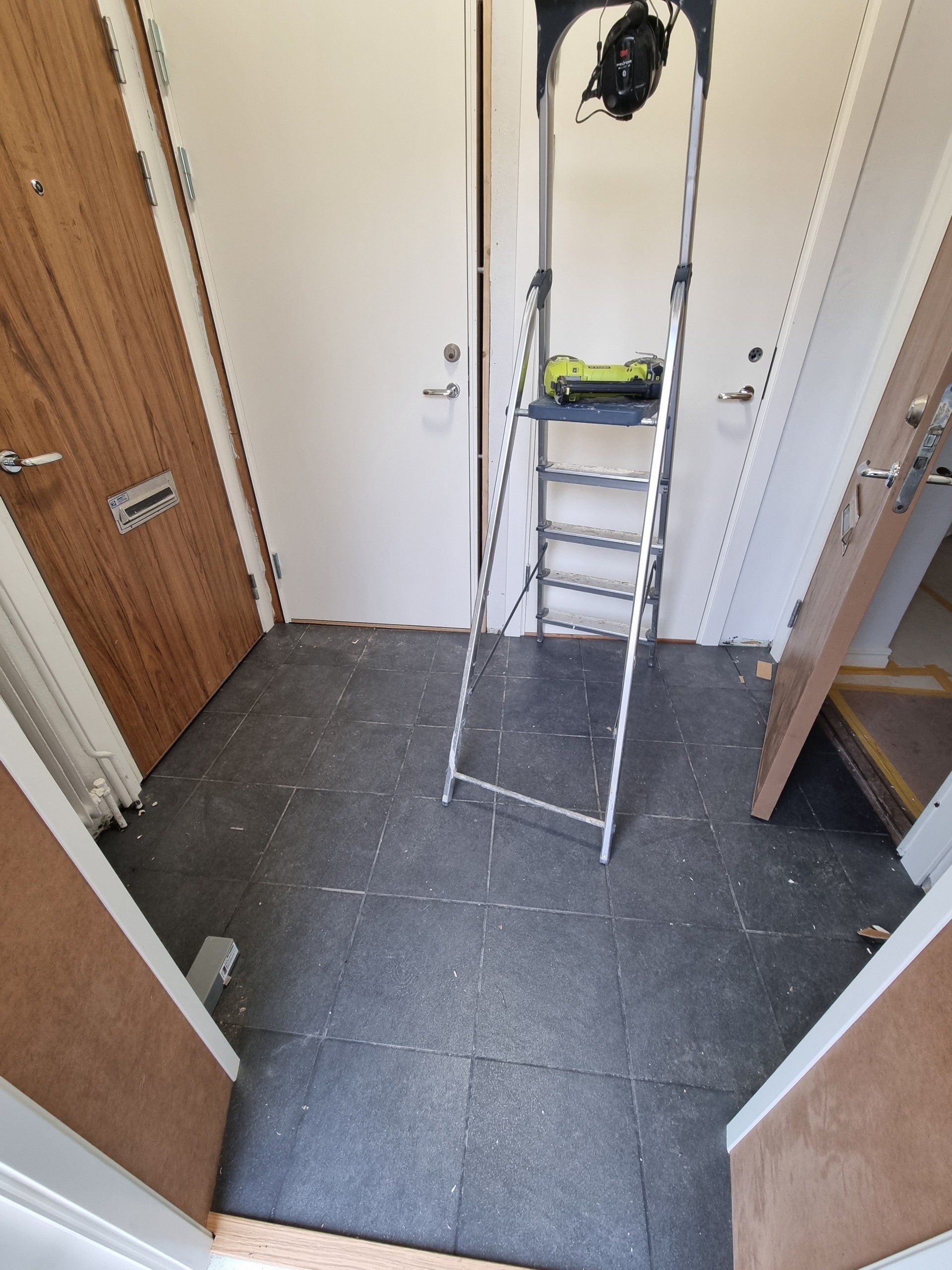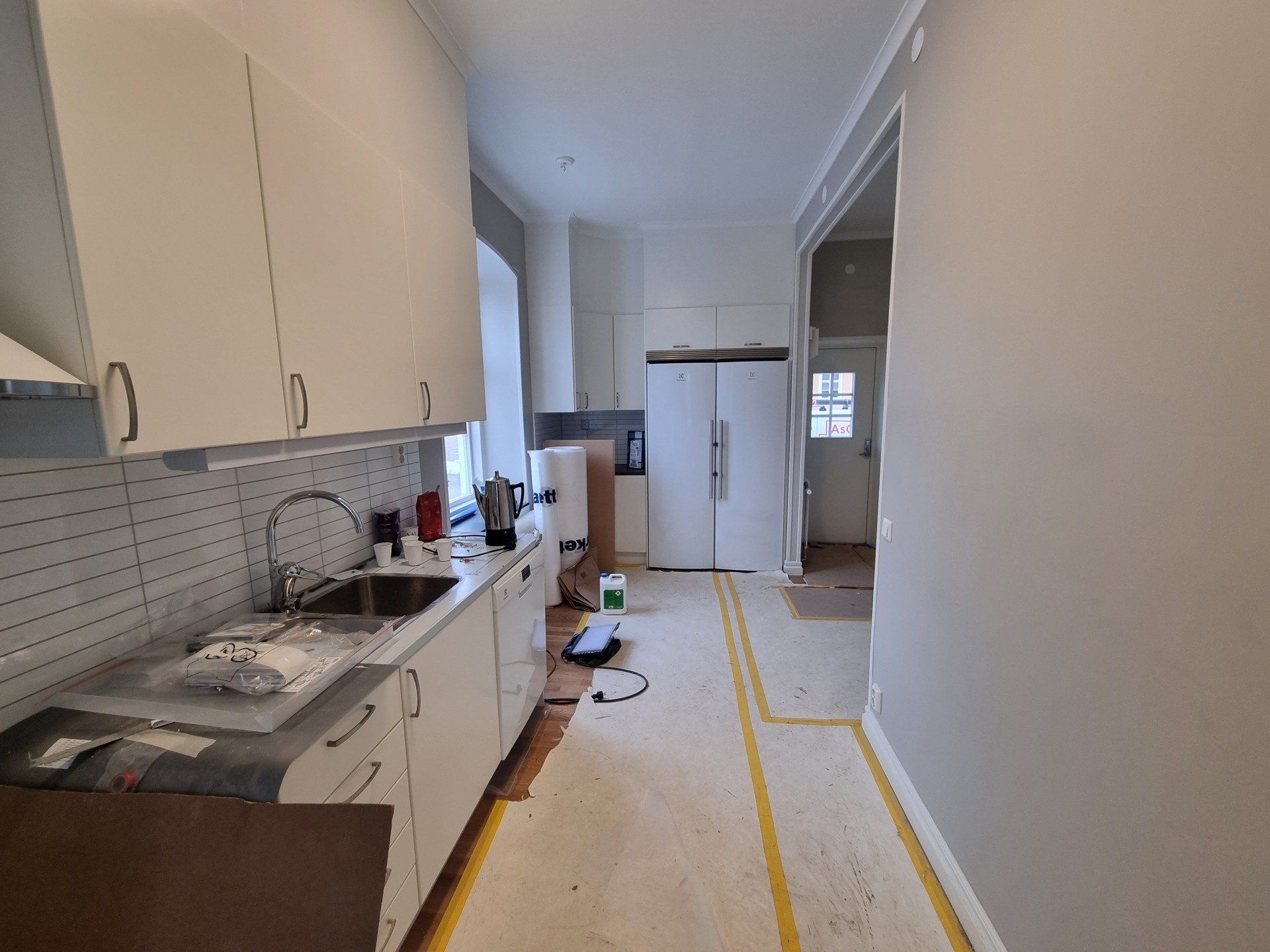 Hela huset kommer att genomgå en totalrenovering under hösten/vintern 2021. Vi har börjat riva ut allt invändigt i de mindre lägenheterna, 1ROK och 2ROK. De större lägenheterna, 3ROK, kommer påbörjas under hösten. Det blir nytt kök och badrum, nya vitvaror och nytt ytskikt i alla lägenheter.